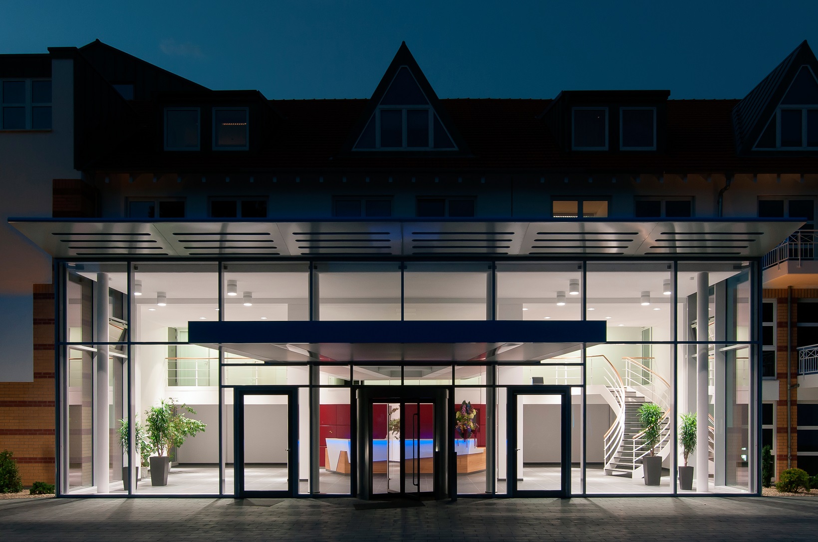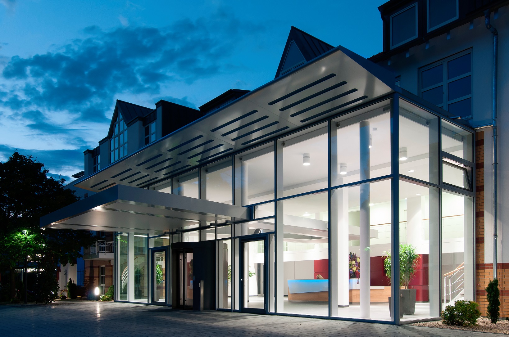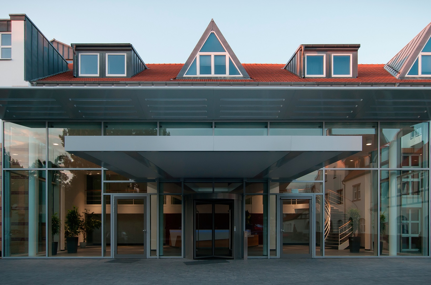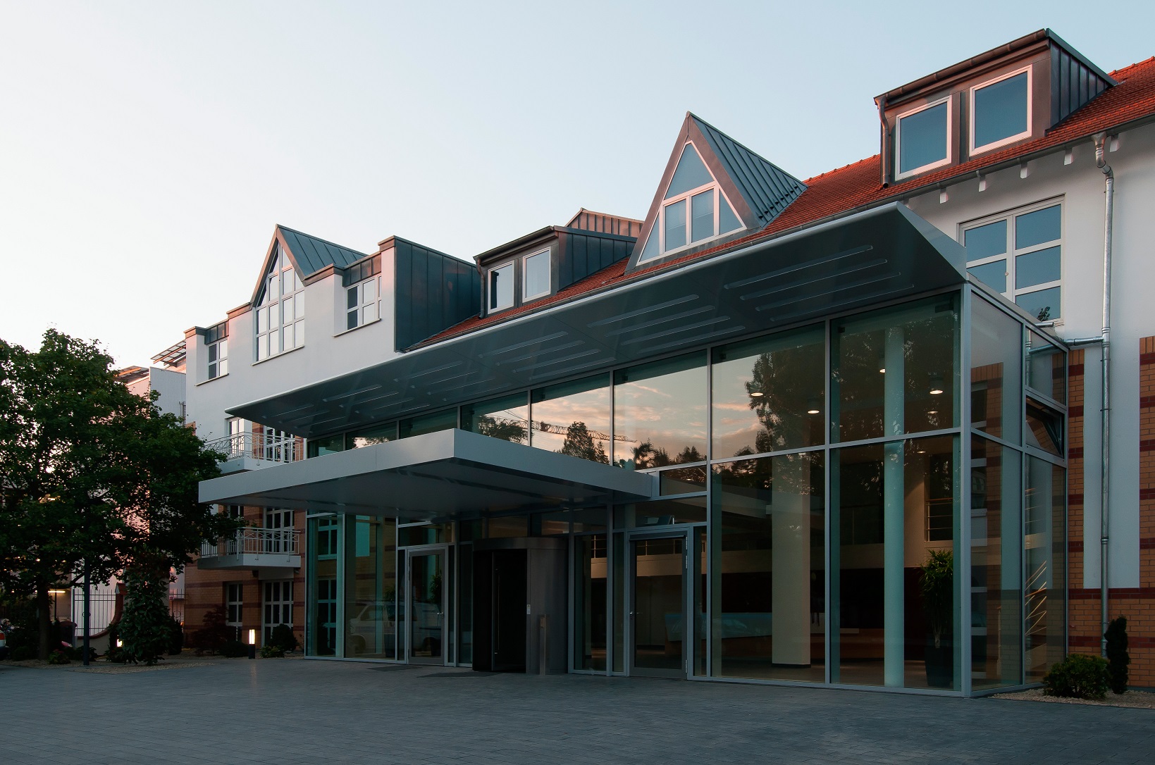 Gläserner Vorbau als Erweiterung der Eingangshalle und Teilentkernung