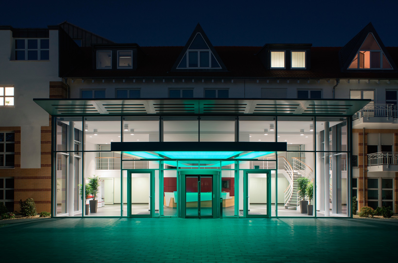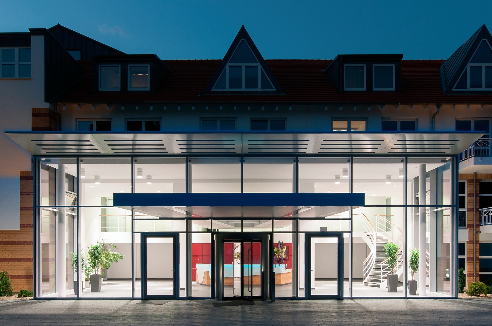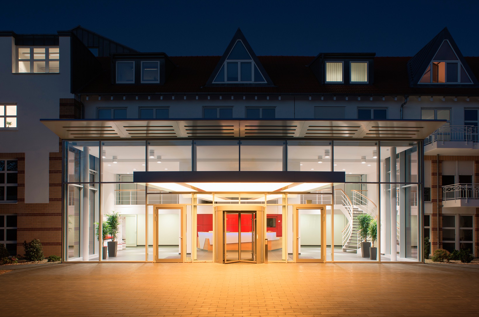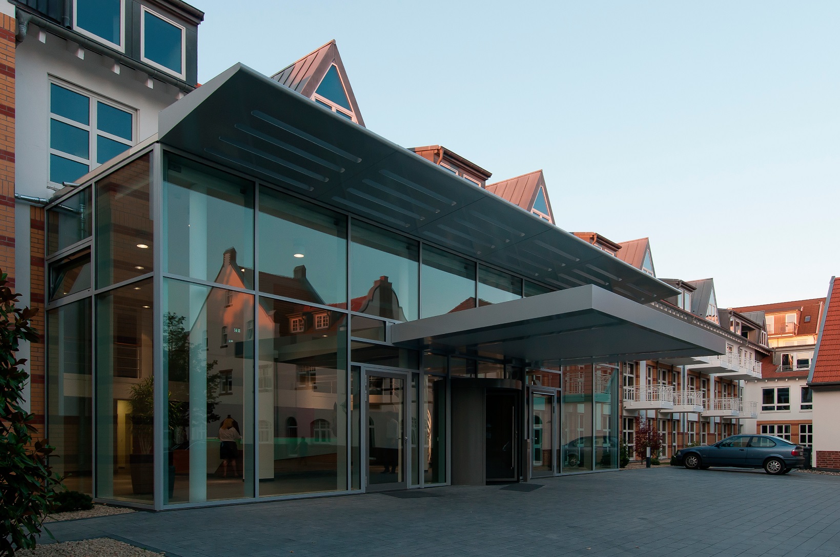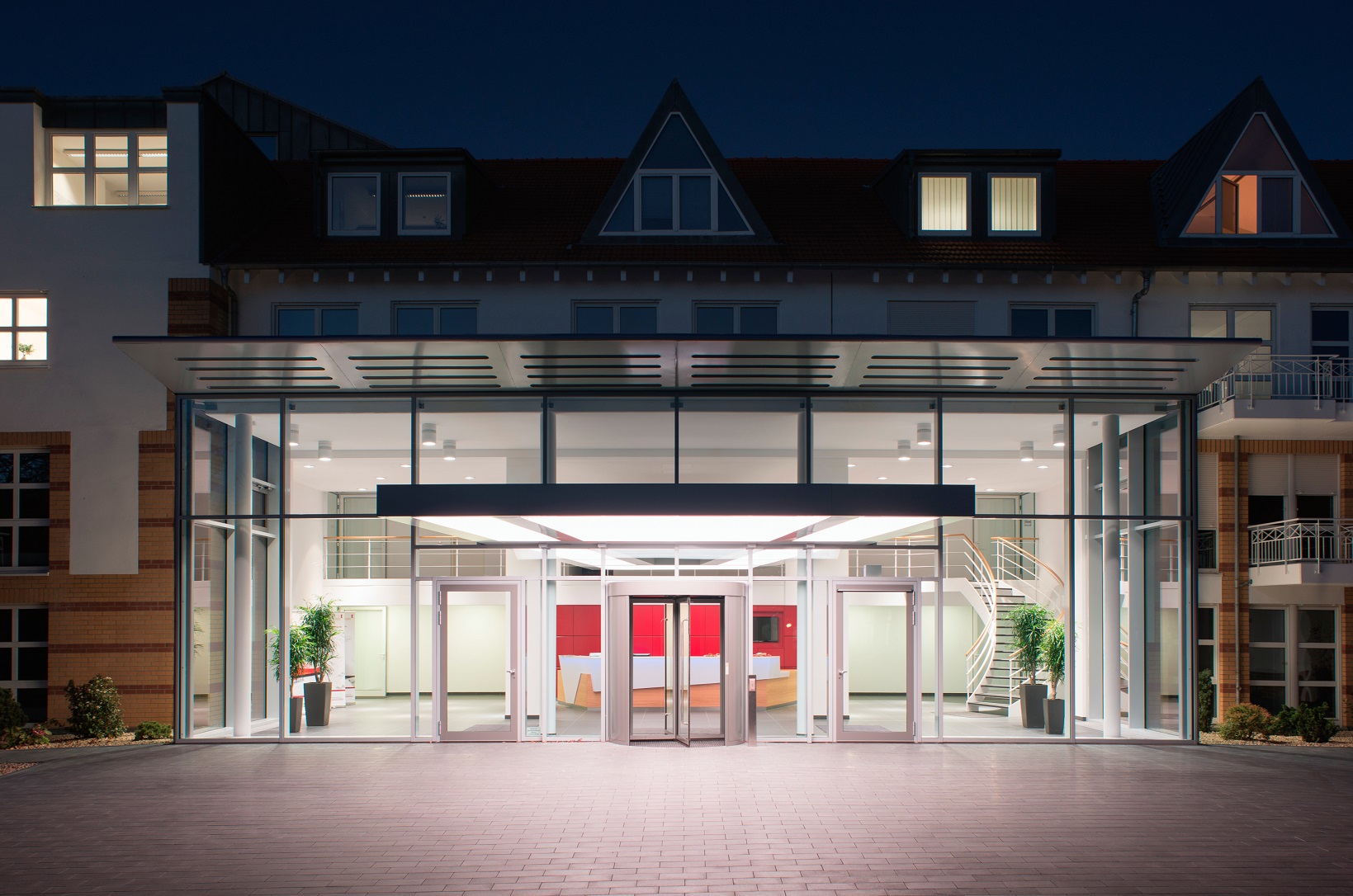 Gläserner Vorbau als Erweiterung der Eingangshalle und Teilentkernung